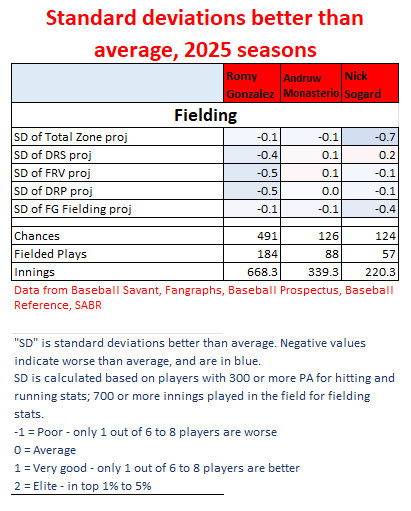 Monasterio stands out a bit on defense, though. While the numbers for their defensive metrics seem to be saying that Monasterio is a little above average defensively while Gonzalez and Sogard are a little below average, if we look at my chart that expresses these defensive metrics as standard deviations above or below average, we see it saying that Monasterio is average, while Sogard and Gonzalez are below average;
