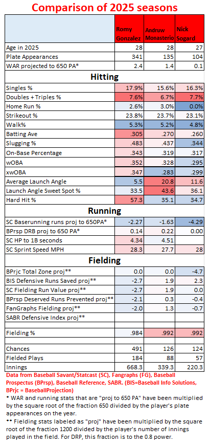 Those are very similar numbers in those top 5 hitting lines for singles, doubles & triples, home runs, walks, and strikeouts. Andruw Monasterio hits like Nick Sogard with more pop, and like Romy Gonzalez with fewer singles (his doubles numbers are a bit lower, but they should get boosted by Fenway Park, so I’ll consider them all equal there).