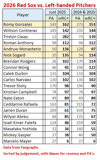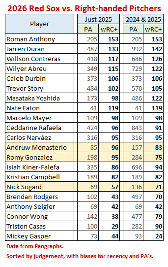 They are also all strong against left-handed pitching. While Sogard is a switch hitter and the other two are righties, their platoon splits are those of right-handed hitters. Here are tables of current Red Sox position players against LHP and RHP: